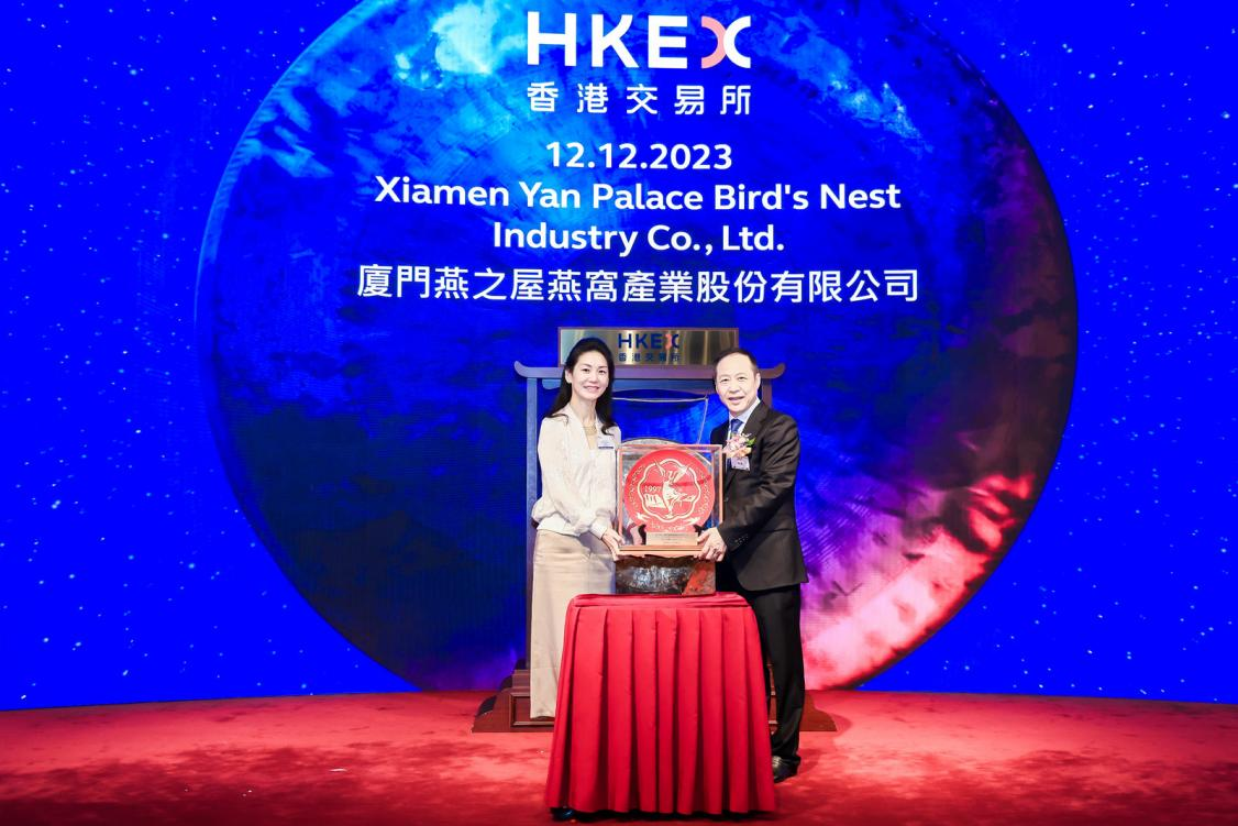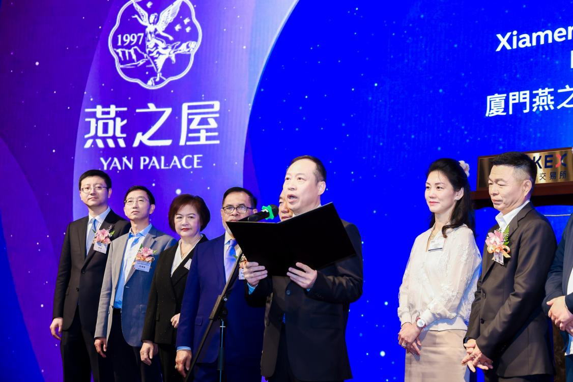 隨后,香港交易所上市委員會委員吳燕安上臺為燕之屋頒贈紀念品,燕之屋創(chuàng)始人、執(zhí)行董事兼董事長黃健代表接受,并回贈禮品?,F(xiàn)場,燕之屋企業(yè)短片亮相大熒幕,燕之屋香港交易所上市儀式圓滿完成。
