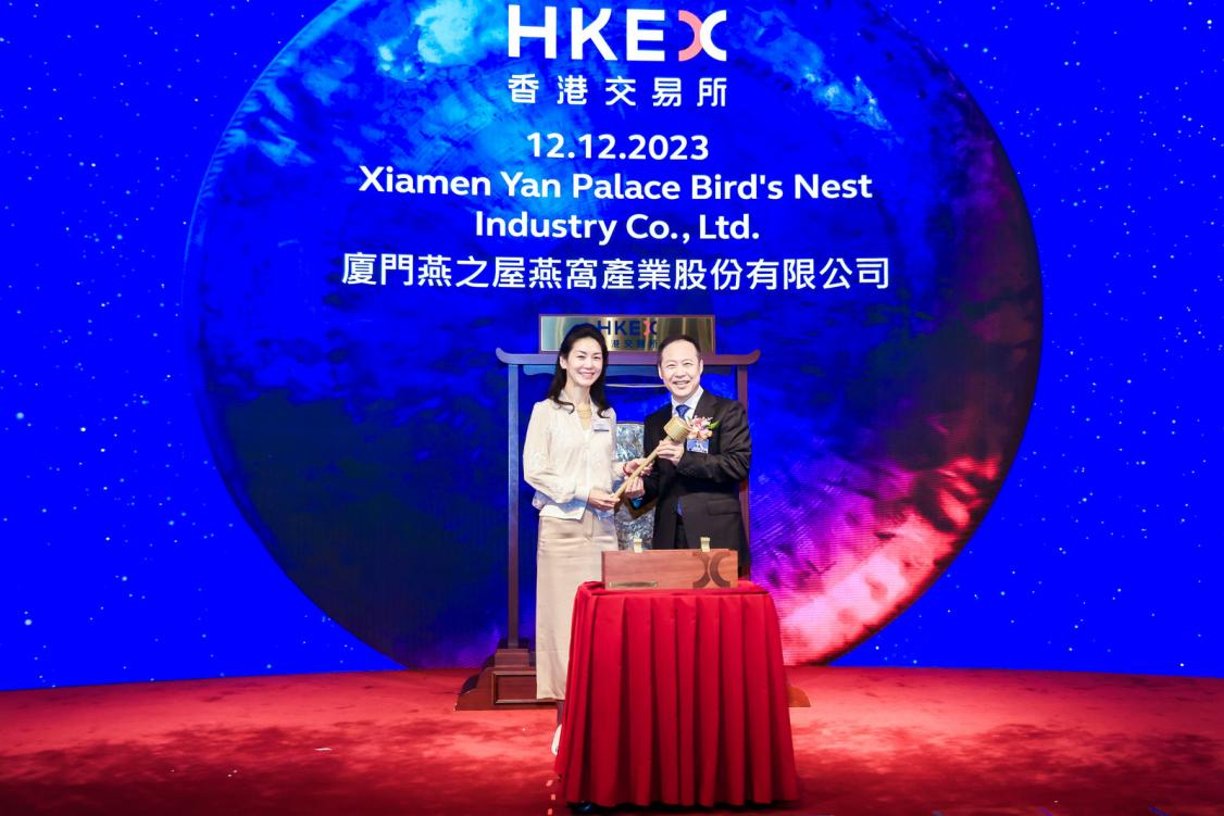 燕之屋創(chuàng)始人、執(zhí)行董事兼董事長黃健,燕之屋執(zhí)行董事兼副董事長鄭文濱,燕之屋執(zhí)行董事兼總經(jīng)理李有泉,燕之屋非執(zhí)行董事劉震,燕之屋非執(zhí)行董事王亞龍,印度尼西亞駐中國和蒙古代表大使周浩黎,廣發(fā)證券股份有限公司董事長林傳輝,全國城市農(nóng)貿(mào)中心聯(lián)合會燕窩市場專業(yè)委員會會長馬增俊,燕之屋執(zhí)行董事兼副總經(jīng)理黃丹艷,中國國際金融香港證券有限公司國際投行部負責人許佳等領導嘉賓出席上市儀式,共同見證燕之屋的高光時刻。燕之屋創(chuàng)始人、執(zhí)行董事兼董事長黃健發(fā)表致辭,他表示:“燕之屋自創(chuàng)立以來,始終秉持匠心,專注于高品質(zhì)的燕窩產(chǎn)品,我們與追求美與健康生活的消費者共同成長,與擁有實力和遠見的伙伴并肩同行,通過匠心與科技的完美融合,打造出今天的中國燕窩產(chǎn)品市場頭部品牌。今天,燕之屋正站在全新的起點上,我們將立足過去、繼往開來,以不斷升級的研發(fā)能力為基石,擴大產(chǎn)品組合、投身智能制造;關注消費者的需求、擴大生產(chǎn)能力、深化銷售網(wǎng)絡、構(gòu)建客戶關系;積極探索各類戰(zhàn)略合作,助力中國燕窩市場的成長壯大。”隨著倒計時結(jié)束,燕之屋創(chuàng)始人、執(zhí)行董事兼董事長黃健與燕之屋執(zhí)行董事兼副董事長鄭文濱手持鑼棍共同敲響寶鐘,燕之屋正式宣告在香港交易所成功上市。
