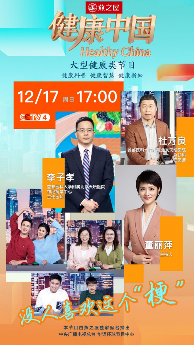 本期,由燕之屋獨家冠名的CCTV-4大型健康類欄目《健康中國》特邀首都醫(yī)科大學(xué)附屬北京天壇醫(yī)院急診科主任醫(yī)師杜萬良和首都醫(yī)科大學(xué)附屬北京天壇醫(yī)院神經(jīng)病學(xué)中心主任醫(yī)師李子孝為大家解讀腦梗死,從專業(yè)的角度分析它的致病機理和預(yù)防手段。