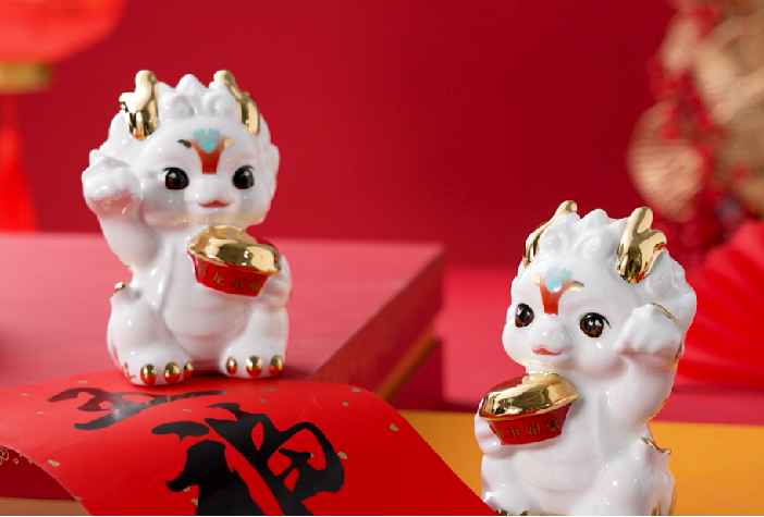 燕之屋龍行龘龘新年禮盒美味與趣味兼?zhèn)?,?nèi)贈(zèng)燕之屋&永豐源聯(lián)名限定金燕祥龍?zhí)沾蓴[件2個(gè),精致玲瓏,憨狀可掬。兩只小福龍一手捧著碗燕,一手迎燕來(lái),開啟新春好兆頭。面部使用龍鱗花鈿裝飾,龍腳踏祥云紋,身上裝飾福字、飛燕紋等,寓意平步青云、突飛猛進(jìn)、步步高飛,為新春禮贈(zèng)增添驚喜與樂(lè)趣。