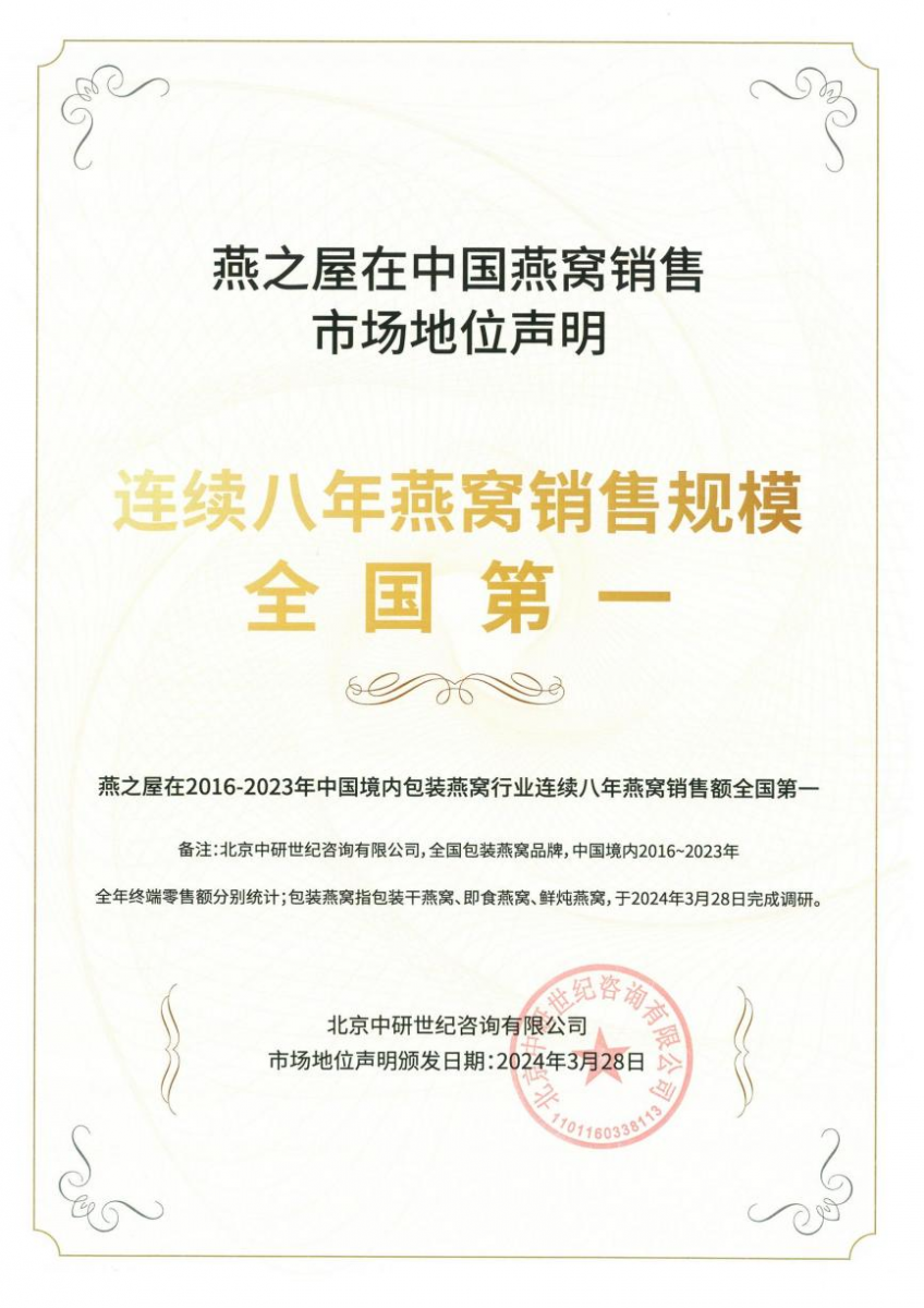 圖:燕之屋在2016-2023年中國境內包裝燕窩行業(yè)連續(xù)八年燕窩銷售額全國第一
