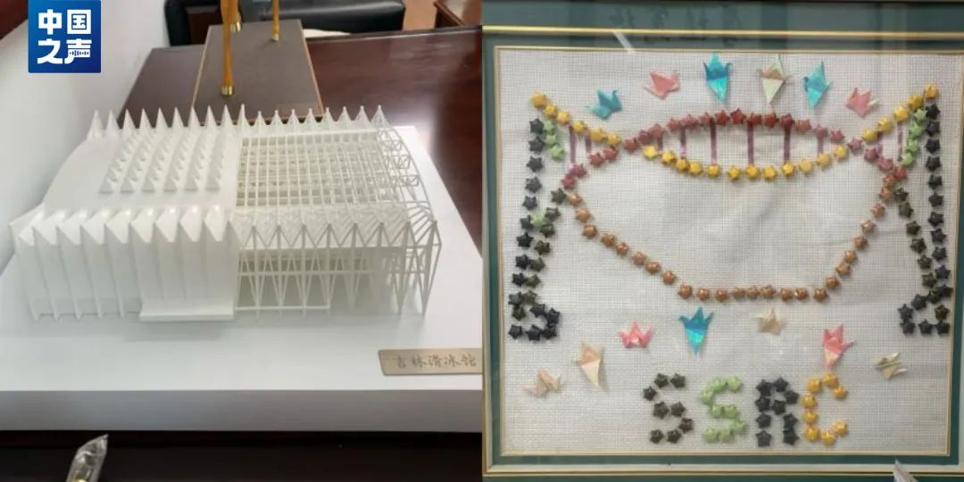 沈世釗的辦公室,一幅手工作品被放在門口最顯眼的位置,那是學(xué)生送給他的禮物。千紙鶴和紙星星拼貼成的雙向拋物線造型圖,定格了回國(guó)后的沈世釗在新領(lǐng)域白手起家的開(kāi)端:參與吉林省滑冰館的設(shè)計(jì)。