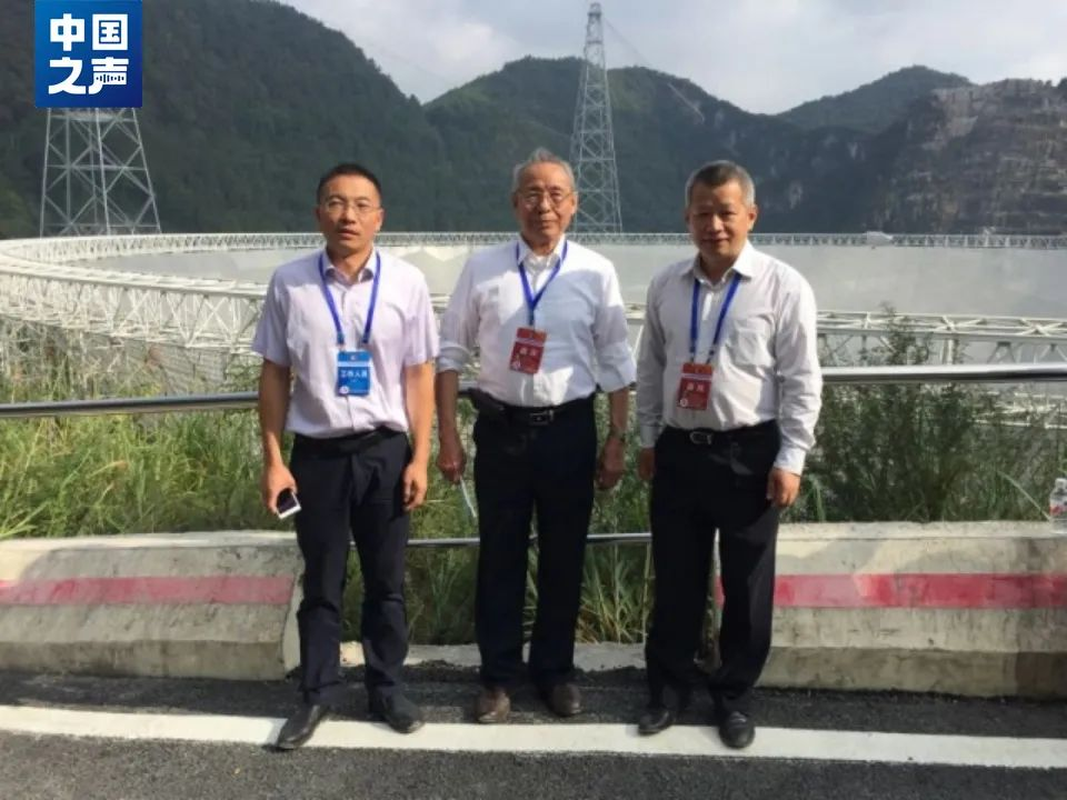 圖:沈世釗(中)和團(tuán)隊(duì)成員在落成的“中國(guó)天眼”前