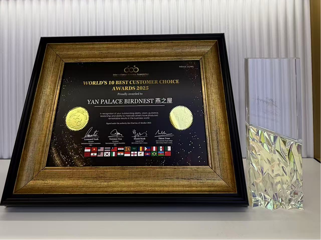 圖:燕之屋榮獲2025國際商業(yè)協(xié)會(huì)(IBA)大獎(jiǎng)——全球十大最佳客戶選擇獎(jiǎng)